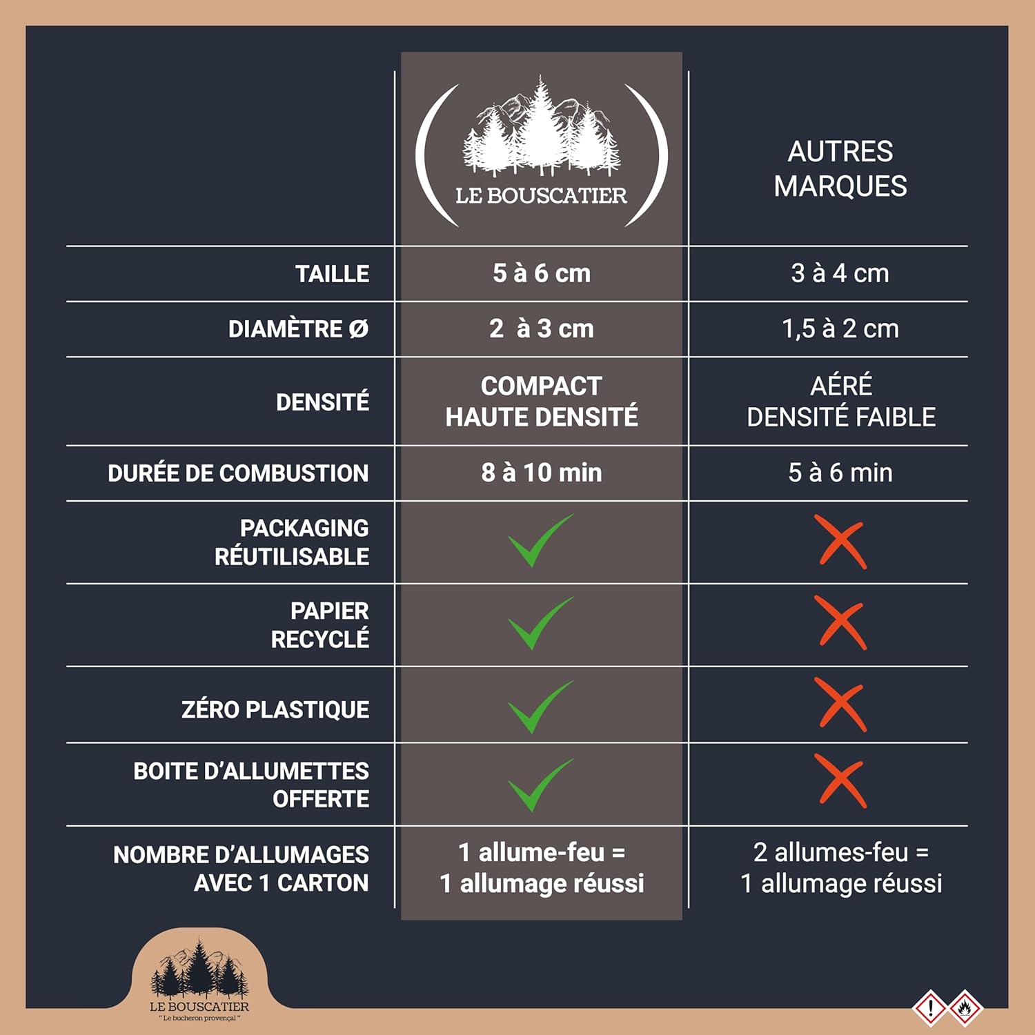 Les cartons d’allumés feux sont conçus pour accueillir entre 5 Kgs d’allumés feux. Une petite boîte d’allumettes est offerte pour vous remercier de nous faire confiance !